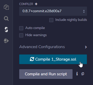 - Save and build the code by opening the "Compiler" menu, and clicking the "Compile 1_Storage.sol" button