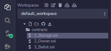 - On the left side of the screen, click the "Files" menu, open the "Contracts" folder, and click on the 1_Storage.sol file to open it