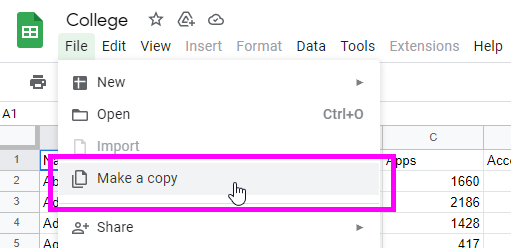 In order to work with it, it will be necessary to sign into a Google account. Once signed in, select "Make a copy" from the "File" menu: