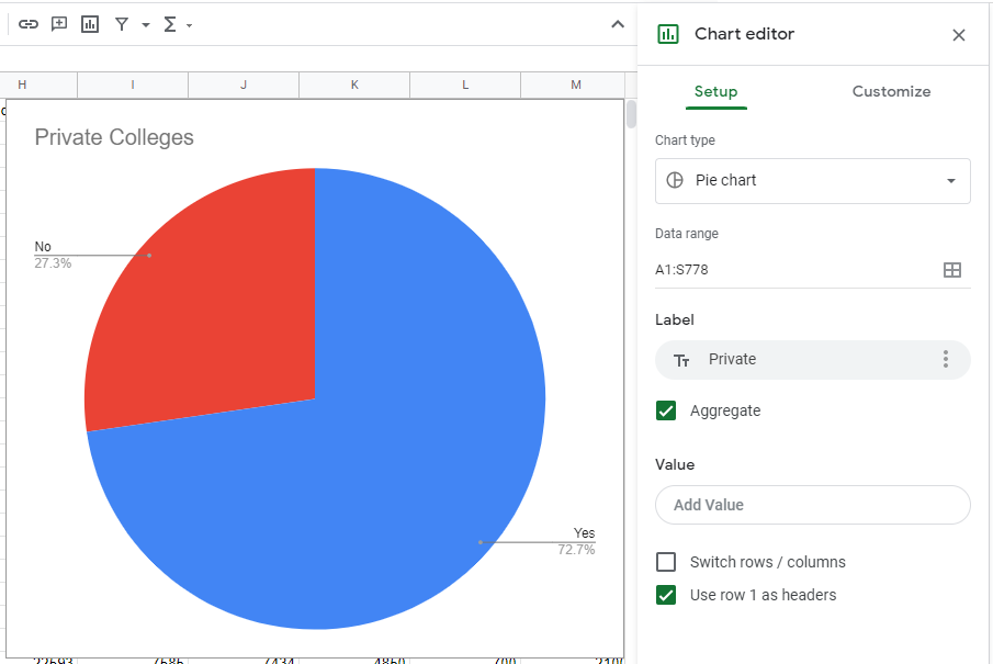 Start with a basic chart showing how many of the colleges are private, and how many are public.