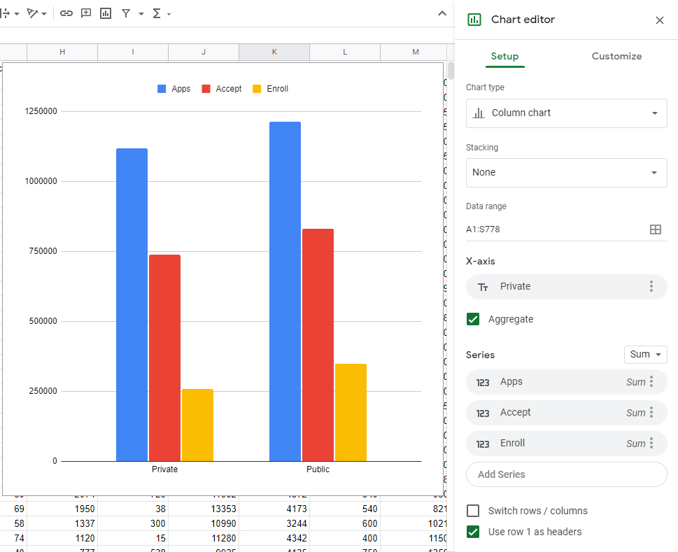 For the next chart, find out how many students applied, were accepted, and enrolled at both private and public colleges.