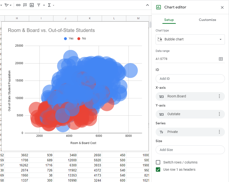 To continue this line of thinking, change the chart into a Bubble chart, and add "Private" as the color dimension. The settings should be something like this: