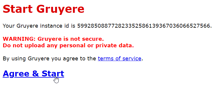 - Click on "Agree & Start" to spin up a new instance of the Gruyere application