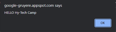 <html> <head> <script> alert("HELLO Hy-Tech Camp"); </script> </head> </html>