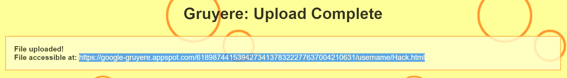 That means that Gruyere ran the exploit code from the Hack.html file. You've successfully hacked Gruyere!