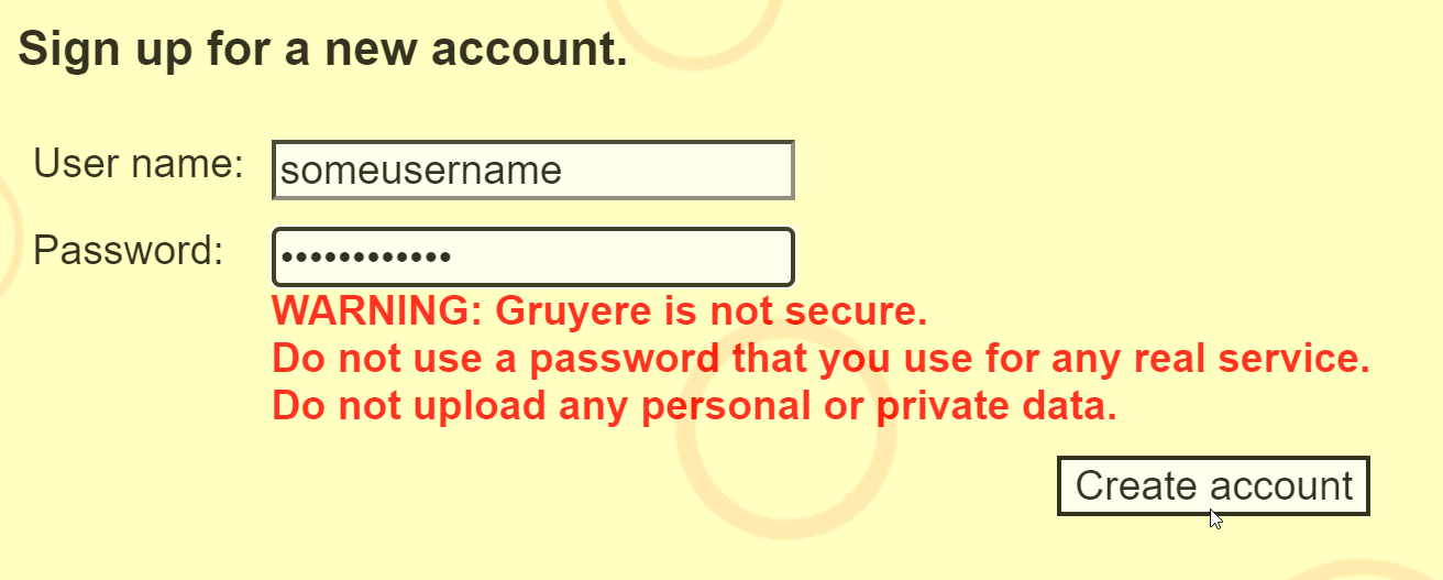 Now you have successfully created a Gruyere account! Note that this account will only exist on your specific instance of Gruyere.